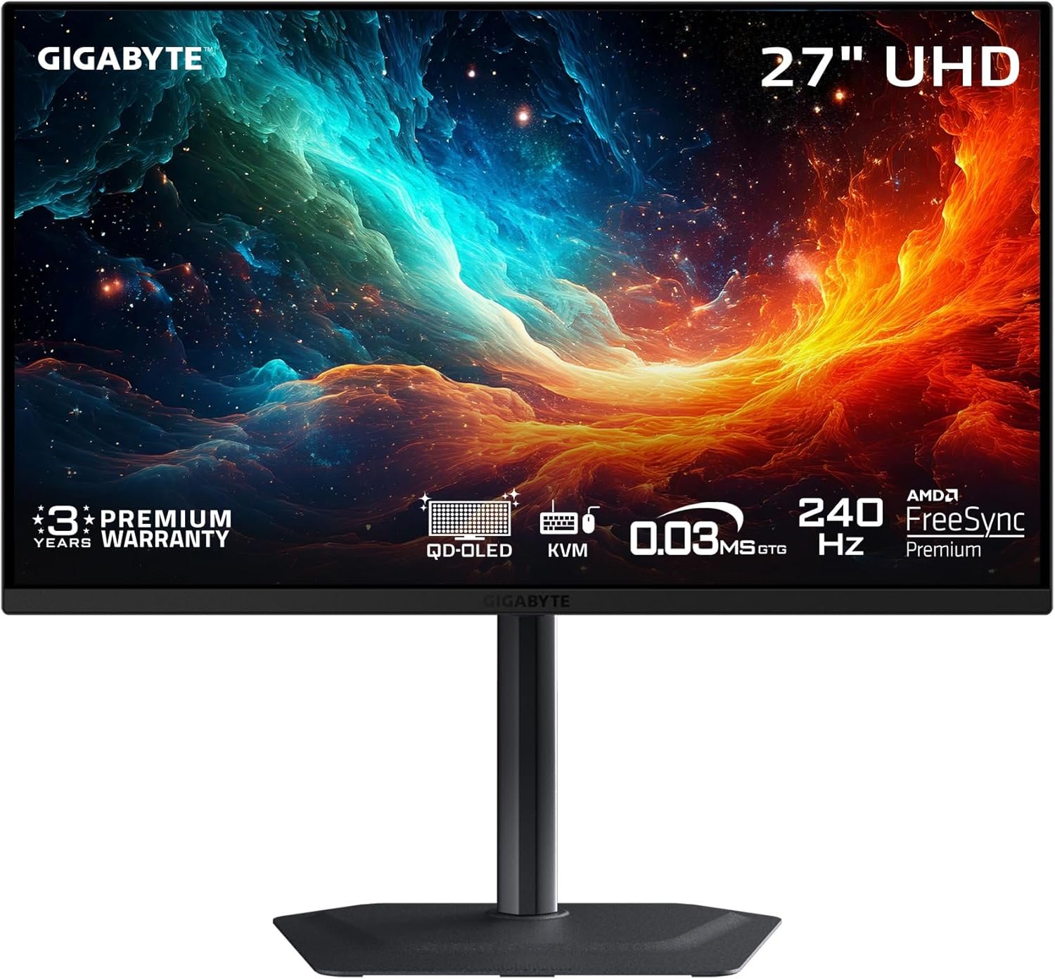 GIGABYTE – MO27U2-27 QD-OLED Gaming Monitor – UHD 3840×2160-240Hz – 0.03ms GTG – AMD FreeSync Premium Pro, G-SYNC Compatible – Type C KVM – HDMI, DP, Type-C – Height and Tilt Adjustable – Black
